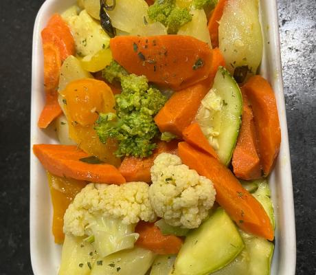 Filé grelhado, acompanhado de panaché de legumes salteados no azeite e arroz à grega.