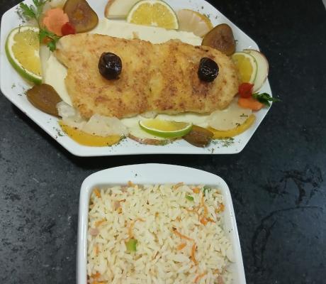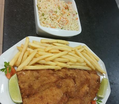 Filé empanado à moda da casa, recheado com presunto e queijo mussarela, acompanhado de batatas fritas e arroz à grega.