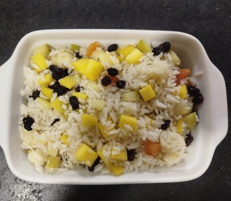 Filé grelhado, regado com molho escuro apimentado à base de vinho e champignon, acompanhado de salada de maionese com presunto e arroz à grega.