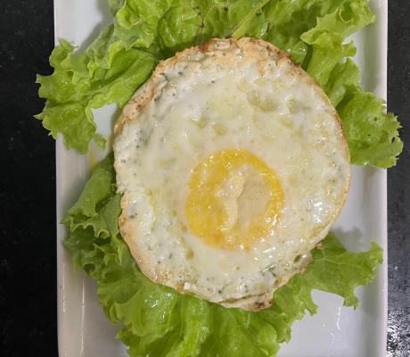 120g de carne moída, ovos de codorna, molho à base de tomate, acompanhado de torradas.