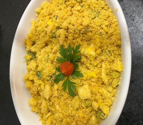 50g de bacalhau refogado com azeite e cebola, cobertos com creme de macaxeira gratinado com queijo parmesão.