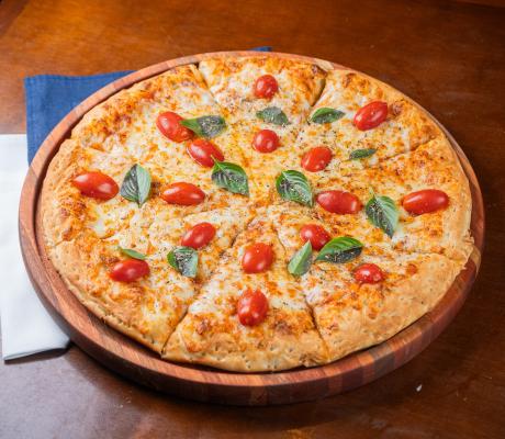 Molho pomodoro, mussarela de búfala, tomate cereja, manjericão e orégano.