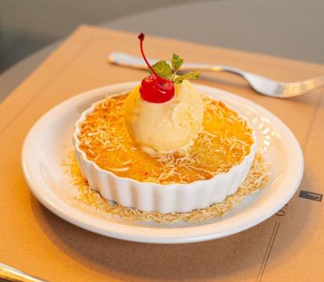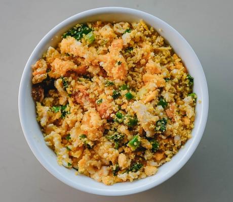 Carne de caranguejo gratinada com queijo parmesão, servida com farofa de dendê e limão.