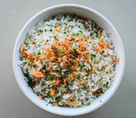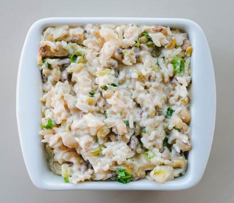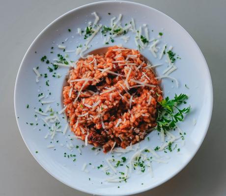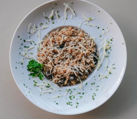 Arroz arbório, cebola, vinho branco,caldo de legumes, salmão grelhado, manteiga e queijo parmessão
