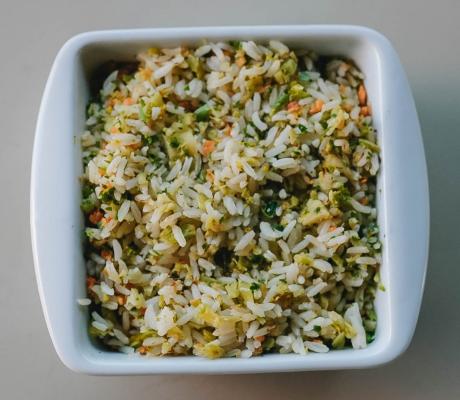 Filé de peixe grelhado com legumes a juliene, com arroz à grega e batatas sauté.