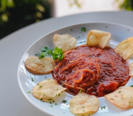 Filé mignon, molho pomodoro, queijo parmesão e rúcula