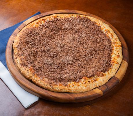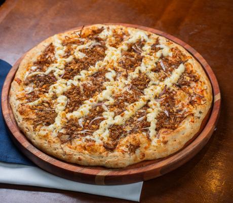 Molho tomate, mussarela, carne de sol desfiada, cebola em rodelas, alho frito e catupiry.