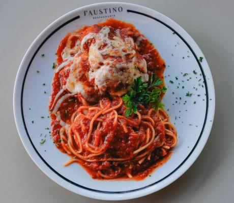 Pão italiano, molho pomodoro, filé trinchado e queijo parmesão.