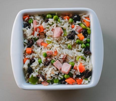 Camarões com presunto, ervilha, molho branco, mussarela e arroz branco gradinados, finalizado com camarões recheados e batata palha.