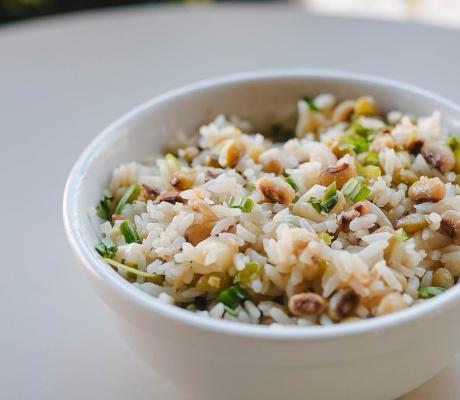 Filé de camarão refogado, servidos com arroz cremoso e finalizados com camarões recheados e cebola crispy.