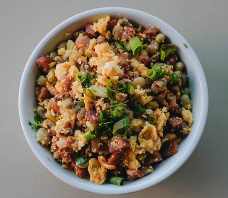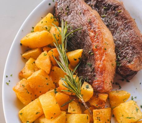 Filé de cordeiro assado na brasa. acompanha batata sauté, vinagrete e farofa.