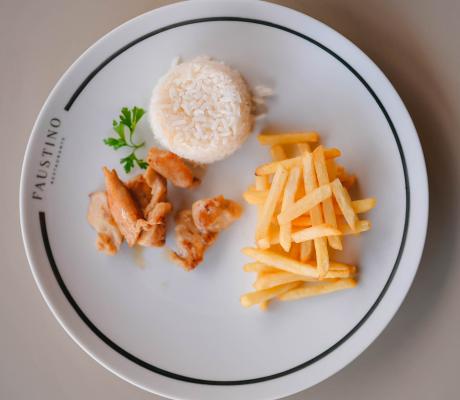 Frango desossado assado na brasa, acompanhado de baião de dois e batata sauté e queijo coalho