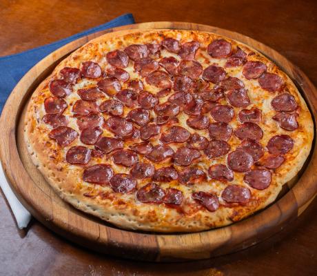Queijo mussarela, milho verde, pimenta calabresa, requeijão, molho de tomate, bacon e calabresa.