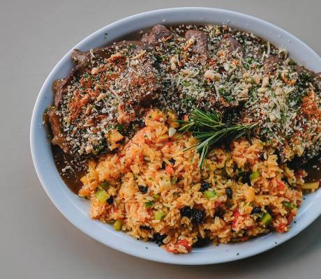 Costela de cordeiro cozida no vinho tinto e legumes, farofa de ovos com banana e molho chimichurri.