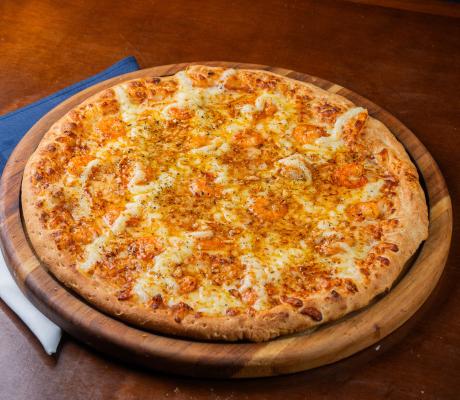 Queijo mussarela, molho de tomate, presunto, requeijão, bacon e peito de frango.
