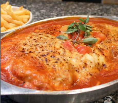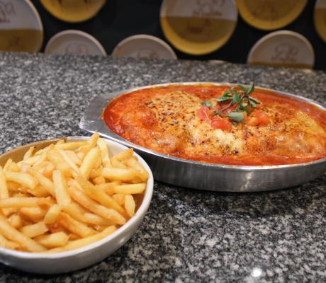 Filé à milanesa com molho de tomate, queijo, batata frita e arroz branco ou fettuccine nidi.