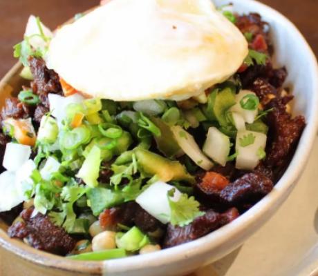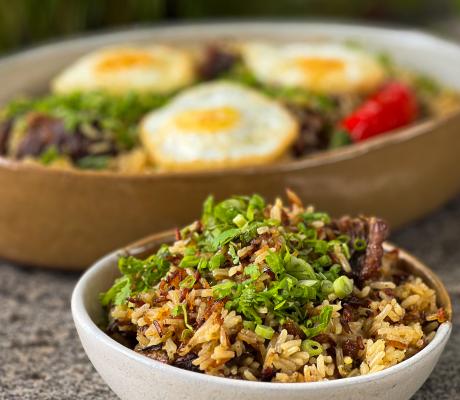 Baião de dois com queijo, batatas crocantes, farofa e vinagrete.