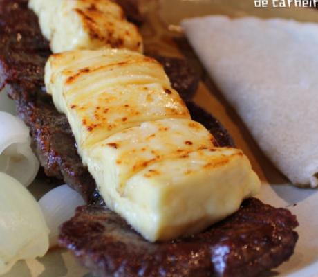Queijo coalho, macaxeira, pão de alho, cebola, farofa e vinagrete.