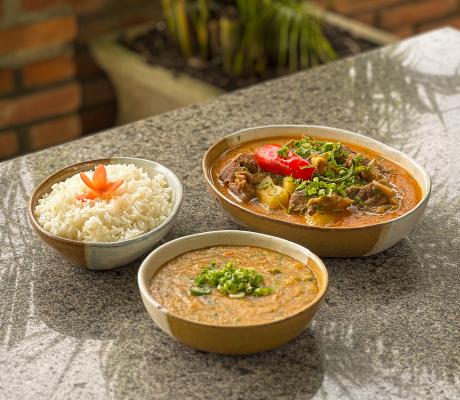 Acompanha purê de macaxeira, pão de alho, cebola, farofa e vinagrete.