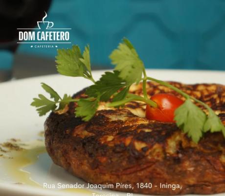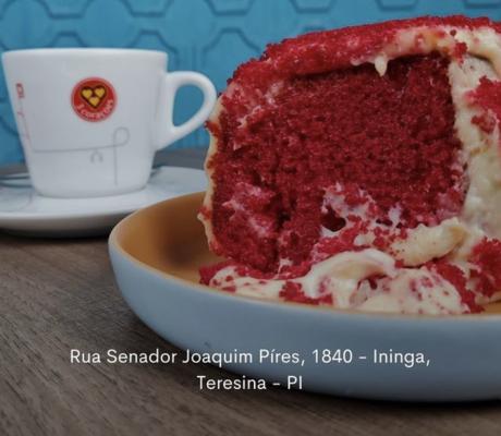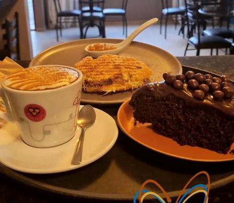 01 cappuccino grande + 01 bolinho de goma recheado com carne de sol e queijo coalho + 01 fatia de bolo chocolatíssimo.