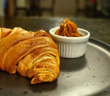 Pão croissant simples acompanha doce de leite ou requeijão .