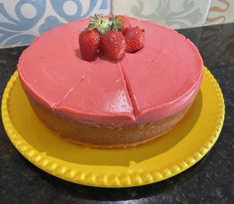 Bolo de massa branca bem molhadinha, coberto com brigadeiro branco suave e geleia de morango feita artesanalmente na casa.