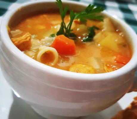 350ml de sopa feita á base de frango, macarrão e legumes acompanhado de torradas amanteigadas!!!