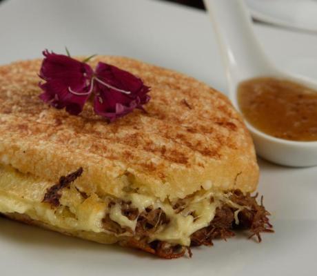 Bolinho regional feito à base de farinha de goma com caroço recheado com carne de sol e queijo ou frango e queijo acompanhado de geléia de abacaxi com pimenta!!!