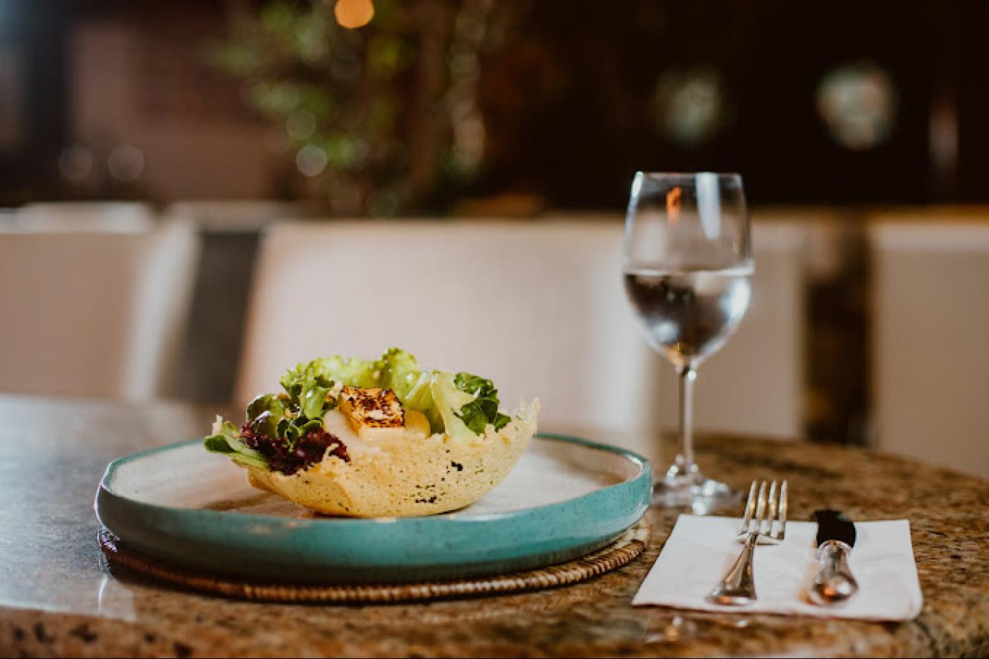 Cesta crocante de parmesão com pêra gratinada ao queijo brie com mix de folhas