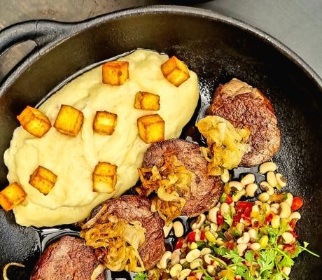 Filé mignon ao molho roti com batata rostie e salada de folhas