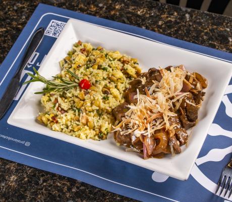 Cubos de carne salteado na manteiga da terra. acompanha: arroz baião de dois e macaxeira palha.